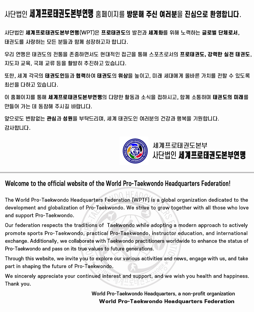 안녕하세요! 사단법인 세계프로태권도본부연맹입니다.
